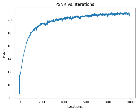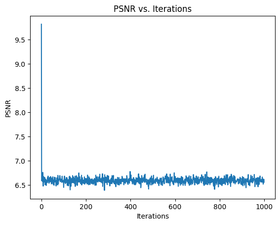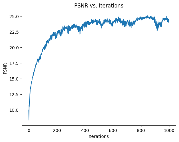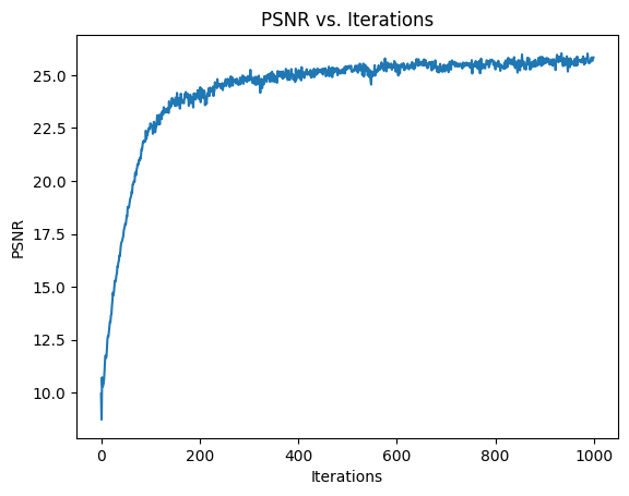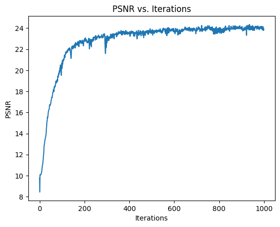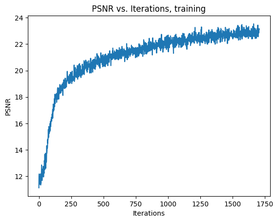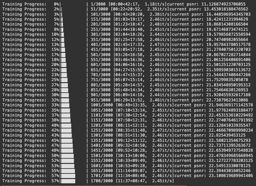 Now, we can train the model. After training for about 1500 iterations, I was able to reach 23 PSNR: