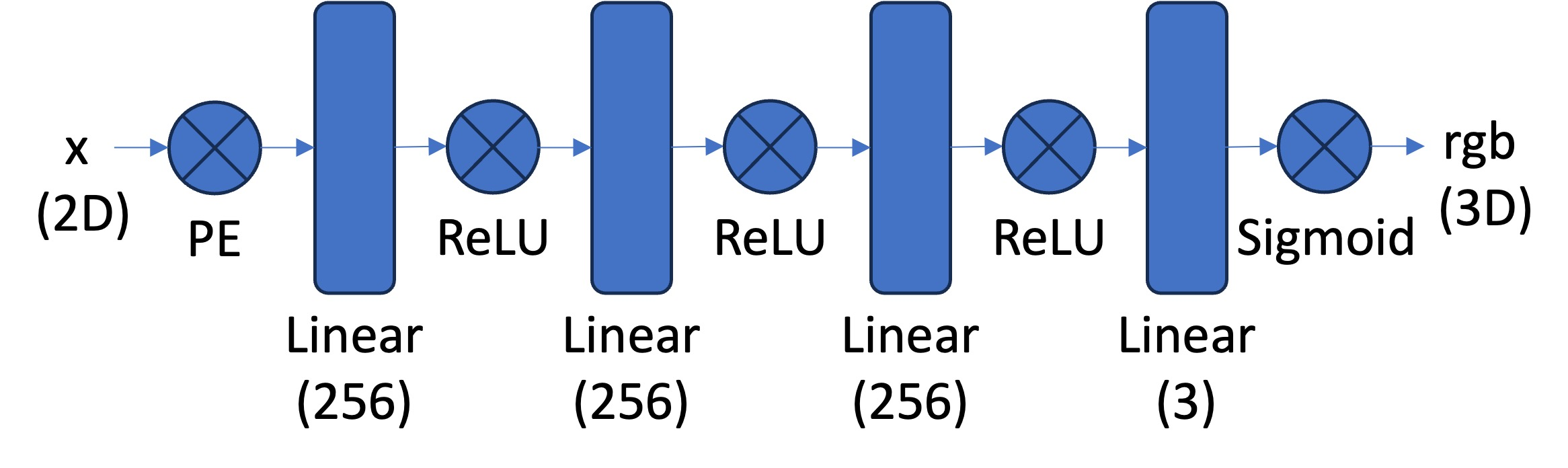 For the architecture of my model, I followed the architecture given in the spec, including a custom sinusoidal positional encoding layer, with a frequency of 10. Therefore, after feeding in the 2D input to this layer, we get a 42D output. For the first training, I just used the suggested hyperparameters: learning rate of 1e-2, same number of layers as the diagram, etc.